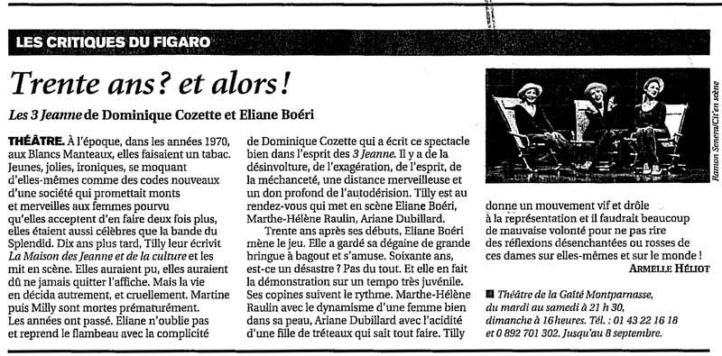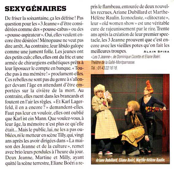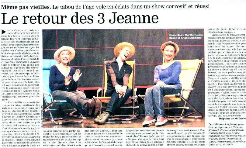 En 2006, Eliane Boéri, fondatrice des 3 Jeanne, me propose d'écrire avec elle son prochain spectacle sur le fait de vieillir. Le projet m'emballe et, pendant quelques mois, nous travaillons de conserve, avec les deux autres comédiennes, Marthe-Hélène Raulin et Annie Stone, qui mettent en bouche les scènes fraîches. Au final, Annie Stone qui a d'autres engagements, sera remplacée en alternance par Ariane Dubillard ou Virginie Lemoine, sur la scène du théâtre de la Gaîté en 2007. Annie Stone reviendra les années suivantes pour les tournées et pour le spectacle suivant "et toujours là".